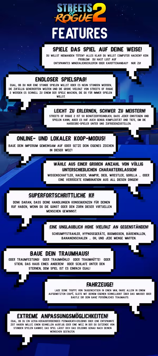 Streets of Rogue 2 lädt dich in eine lebendige, unberechenbare offene Welt ein, in der alles möglich ist. Geh allein oder mit Freunden auf ein wildes Abenteuer, um einen korrupten Präsidenten zu stürzen – auf deine ganz eigene Weise! Wenn dir Sandbox-Spiele mit viel Freiraum für die Entwicklung der Geschichte wie Rimworld, Valheim, Stardew Valley, Kenshi, Terraria oder Dwarf Fortress gefallen, wirst du dich bei Streets of Rogue 2 direkt daheim fühlen. Dieses fesselnde, kompromisslose, systembasierte Spiel bietet dir unzählige spaßige Möglichkeiten, mit der Welt zu interagieren.