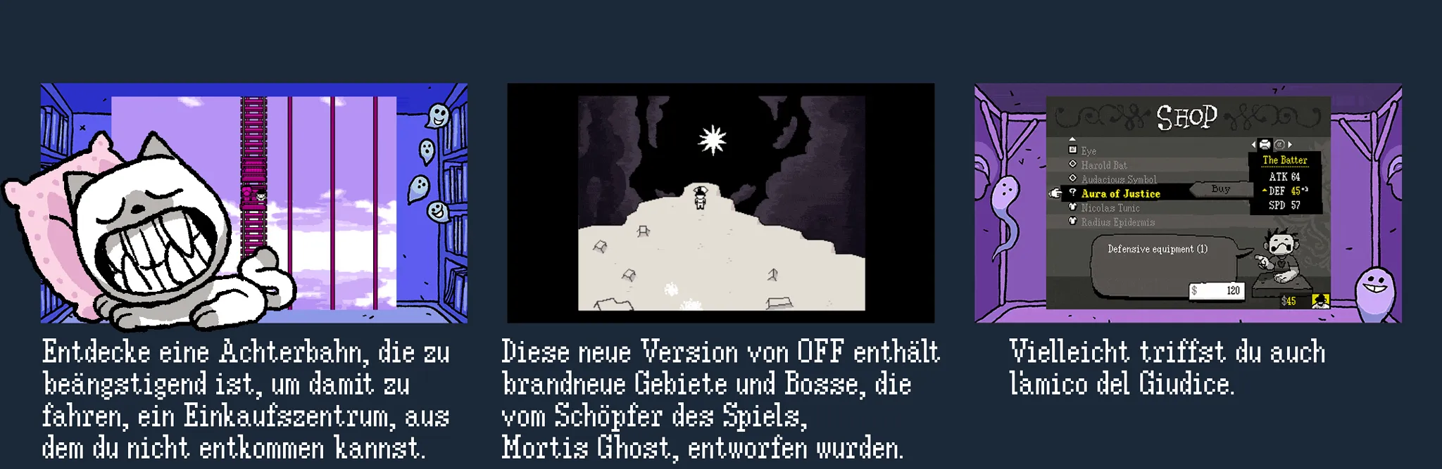 Breite deine Flügel aus und fliege ohne zu zögern zu den vor dir liegenden Zonen! Sie alle sind voller seltsamer und bezaubernder Wesen und bieten jeden modernen Komfort. Allerdings scheint es, als ob sie alle die wohltätige Anwendung des muskulösen Handgelenks unseres Freundes, des Schlagmanns, benötigen. Keine Sorge, mein liebes Phantom – ich, der Richter, werde in den entscheidenden Momenten deiner Suche (geistig und körperlich) bei dir sein.