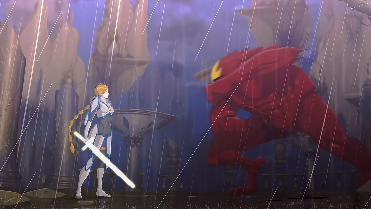 Rasantes Gameplay: Jedes Metroidvania, das sich auf Kampf und Erkundung konzentriert, benötigt ein agiles Kampfsystem und unzählige passive sowie offensive Fähigkeiten... beide Anforderungen sind in Aeterna Lucis enthalten. Die bereits im Vorgänger implementierte Formel wurde nun vollständig verbessert und bietet viel ausgefeiltere Steuerungen, völlig neue Fähigkeiten und exklusive Waffen für die Königin des Lichts.