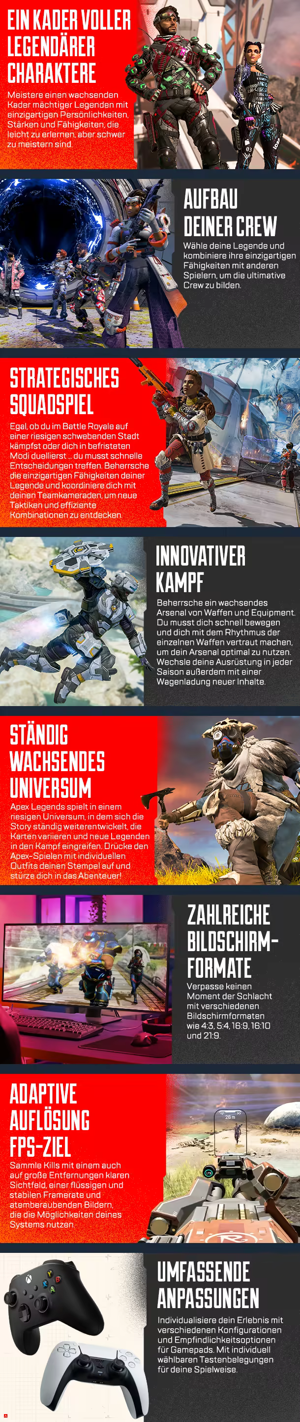 Erobere mit Stil in Apex Legends, einem Free-to-Play* Helden-Shooter, bei dem legendäre Charaktere mit mächtigen Fähigkeiten in Teams am Rand des Grenzlandes um Ruhm und Reichtum kämpfen. Meistere einen ständig wachsenden Kader verschiedener Legenden mit einem umfassenden, taktischen Squad-Spiel und mutigen Innovationen, die über das gewohnte Battle-Royale-Erlebnis hinausgehen – in einer rauen Welt, in der alles möglich ist. Willkommen bei der nächsten Evolutionsstufe des Helden-Shoot...