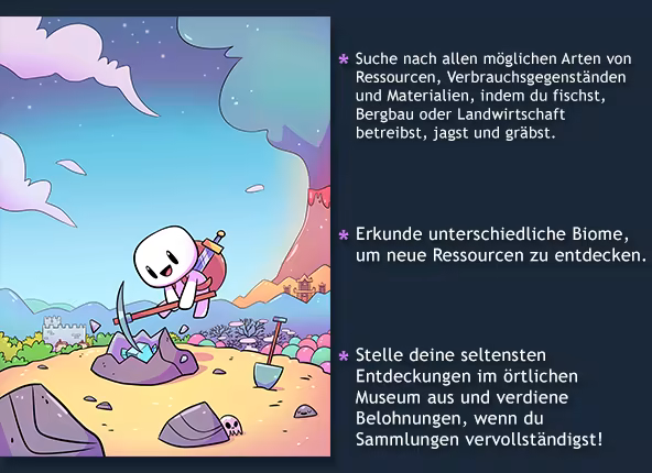 Forager ist ein Open-World-Spiel in 2D, das von Erkundungs-, Farm- und Fertigungsspielen wie Stardew Valley, Terraria und Zelda inspiriert wurde.