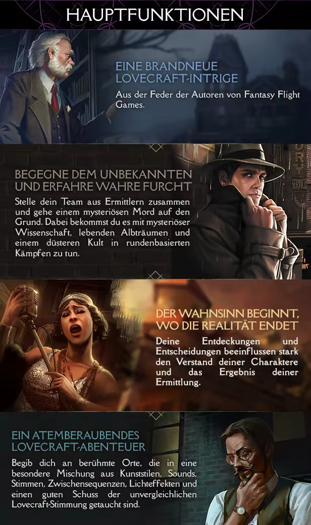 Arkham Horror: Mother’s Embrace ist ein Detektivspiel mit rundenbasiertem Kampf, das in im Kultuniversum von H.P. Lovecraft angesiedelt ist und auf der preisgekrönten Brettspielreihe basiert. Stürze dich in eine Geschichte, die aus der Feder der offiziellen Autoren von Fantasy Flight Interactive stammt und den American Pulp der 20er erkundet.