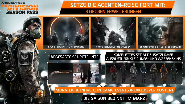 Der Tom Clancy's The Division Season-Pass gewährt dir im ersten Jahr Zugang zu allen drei großen Erweiterungen, eine Bandbreite exklusiver Ausrüstung und Anpassungsoptionen ab dem ersten Tag, sowie jeden Monat besondere Vorzüge und das alles zu einem großartigen Preis. Jede Erweiterung setzt auf The Division auf und führt die Reise deines Agenten mit neuen Inhalten, neuer Ausrüstung und neuem Spielverlauf fort, während du um die Rückeroberung New Yorks kämpfst:
