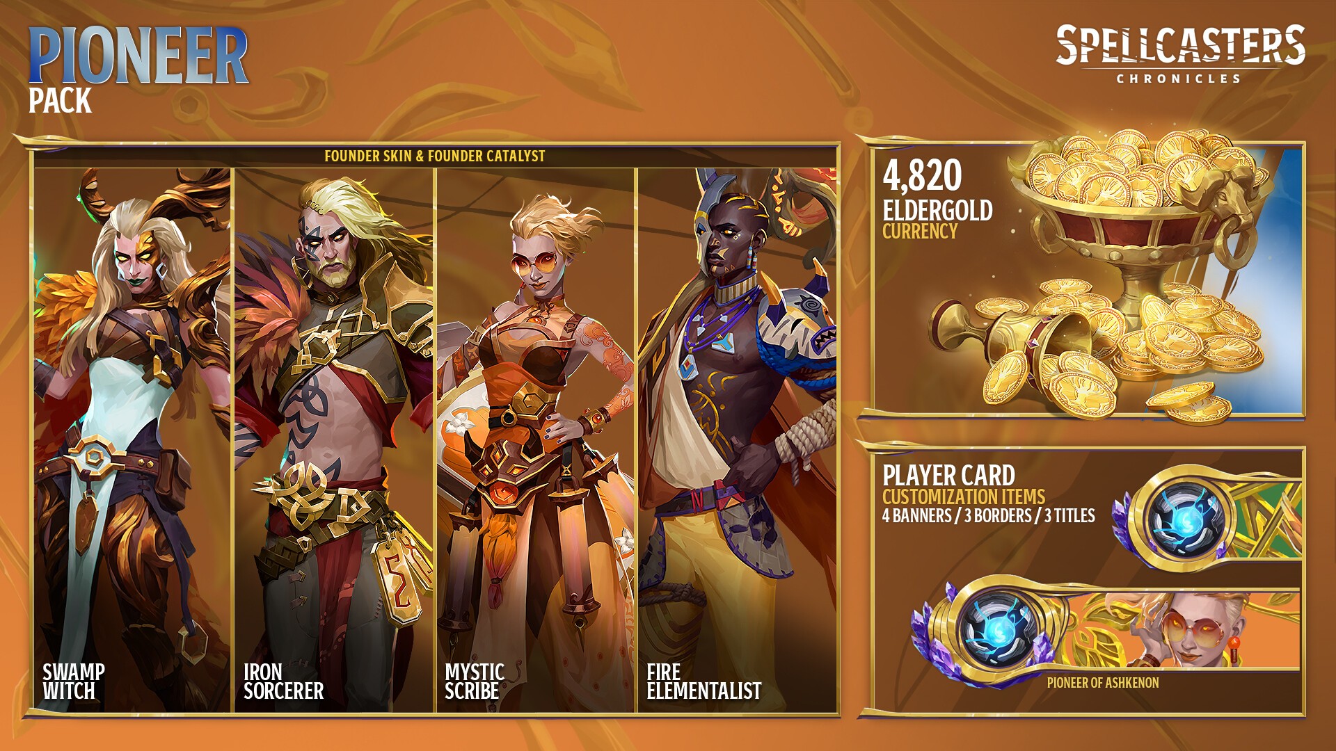 For players ready to blaze a trail.The Pioneer Pack delivers a major customization boost with Founder skins with unique VFX for four Spellcasters, each paired with a matching exclusive Catalyst.Includes :4,820 Eldergold* which can be used to purchase additional cosmetics in-game starting from Early AccessTitles: “Pioneer of Ashkenon,” “Explorer of Ashkenon,” “Founder of Ashkenon”Banner Borders: “Pioneer,” “Explorer,” “Founder”Founder banners: Witch, Sorcerer, Mystic Scrib...