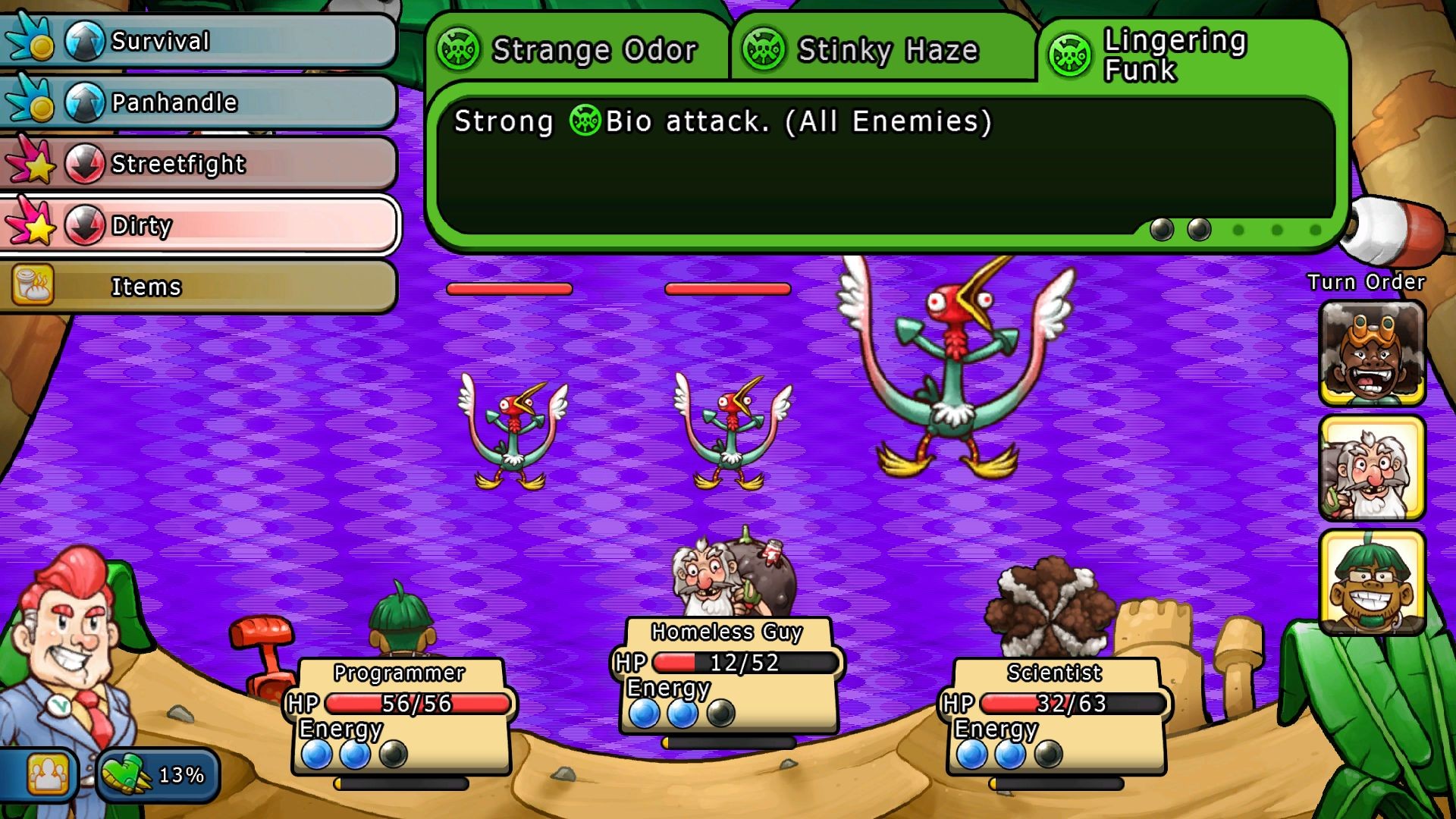 Recruit everyone in sight -- 40 to be exact -- to join your party and fight against uncanny enemies like bees, hippies, fat pharmacists, angry toasters, and more!