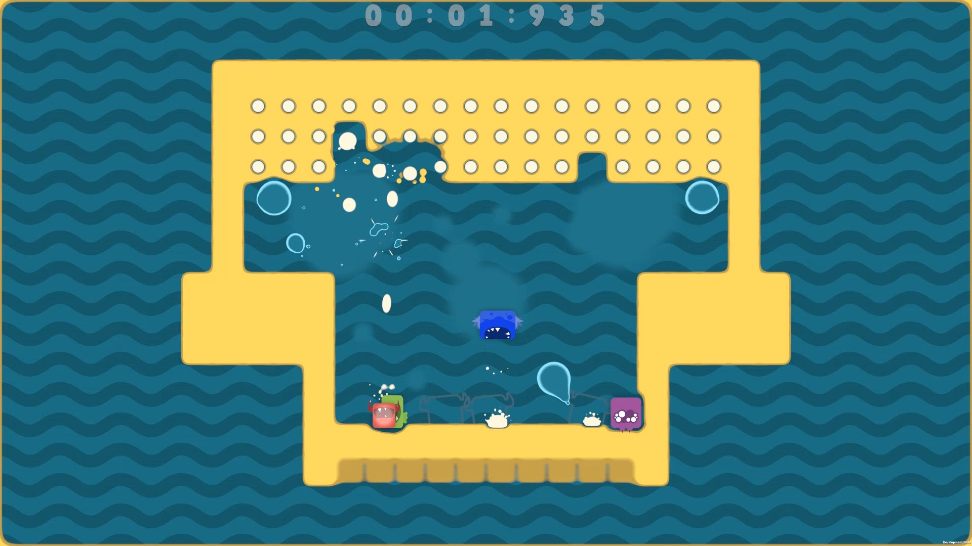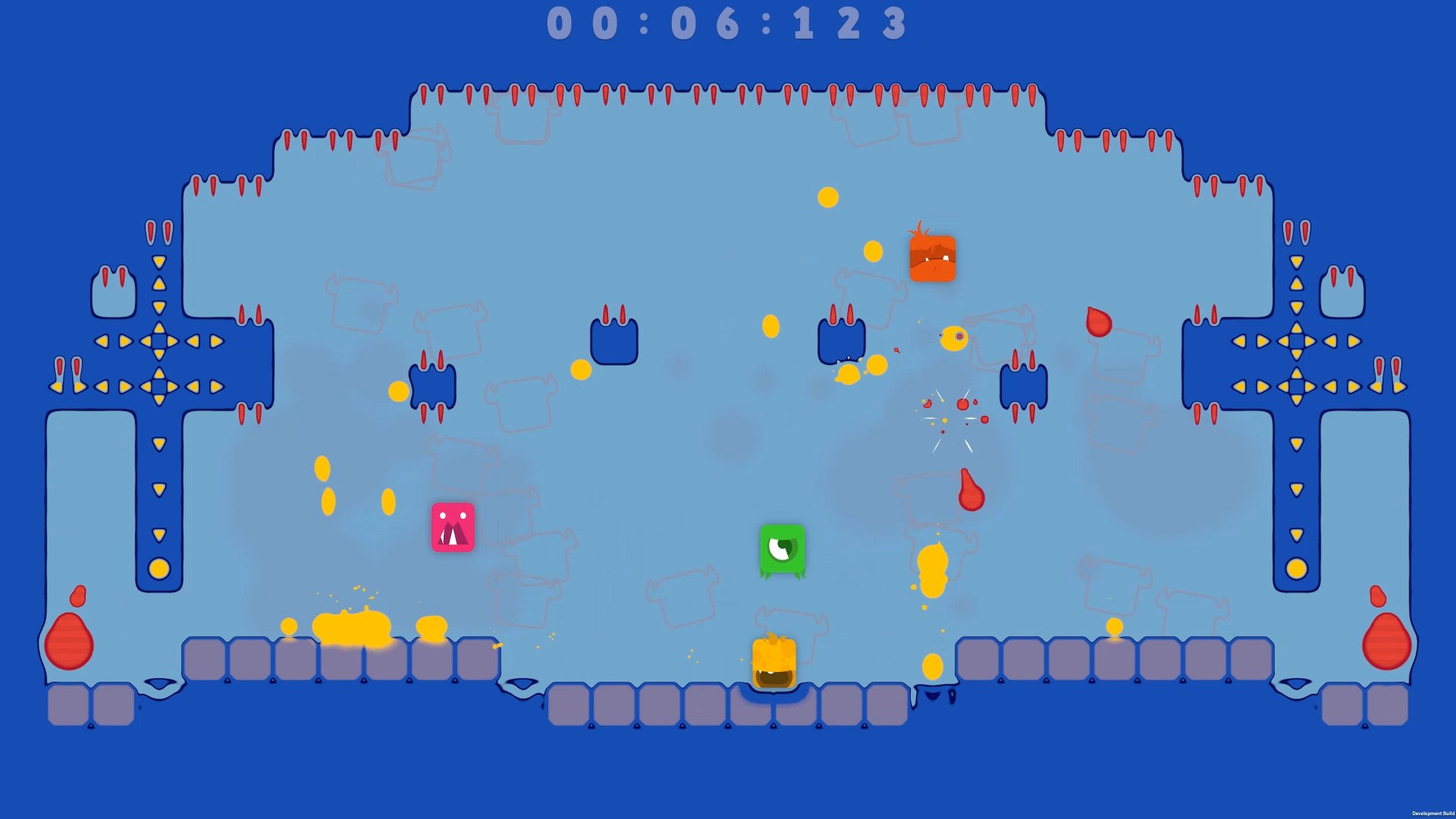 Spitlings is a chaotic action arcade game for one to four players. It puts you in control of the titular Spitlings: charming rectangular creatures with teeth they can spit at bubbles or use to jump!