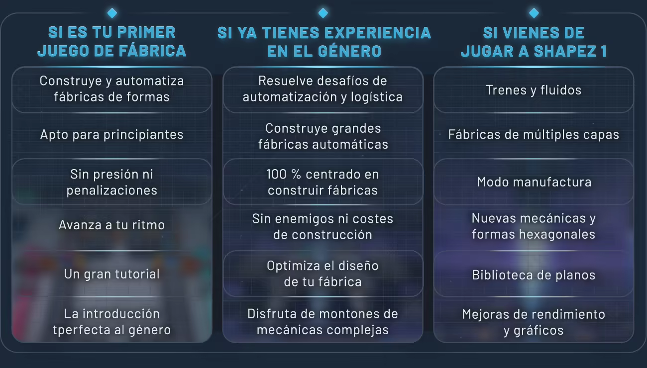 Si busca una lista de todo lo que ofrece shapez 2, estas son sus características más significativas:
