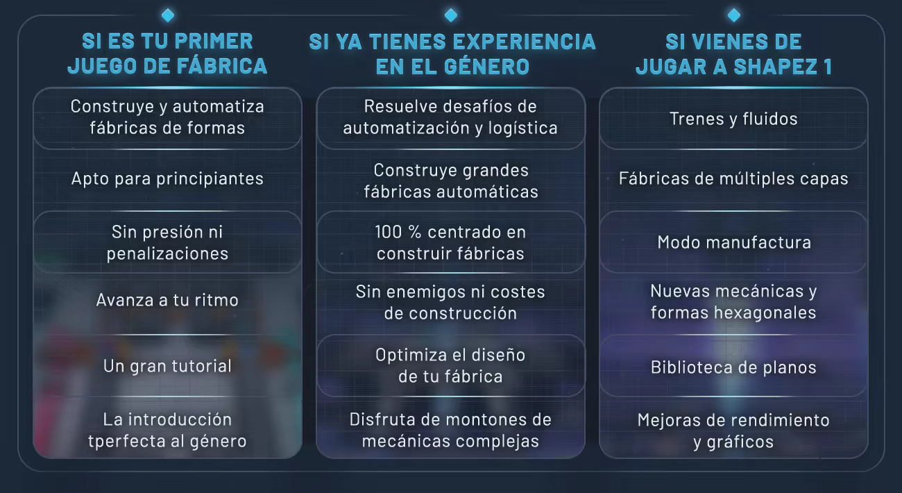 Si busca una lista de todo lo que ofrece shapez 2, estas son sus características más significativas: