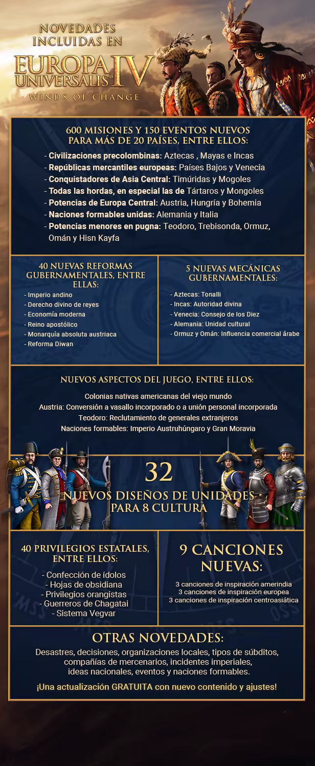 Winds of Change introduce cambios profundos en veinte naciones que se extienden desde las tierras altas andinas hasta las vastas estepas de Mongolia. Disfruta de misiones ramificadas, reformas gubernamentales, eventos, privilegios estatales y más, incluyendo opciones tan drásticas como devolver el Imperio timúrida a una sociedad nómada, llevar a cabo la Revolución Gloriosa para unir los tronos de los Países Bajos e Inglaterra o liderar una invasión indígena americana en Europa.
