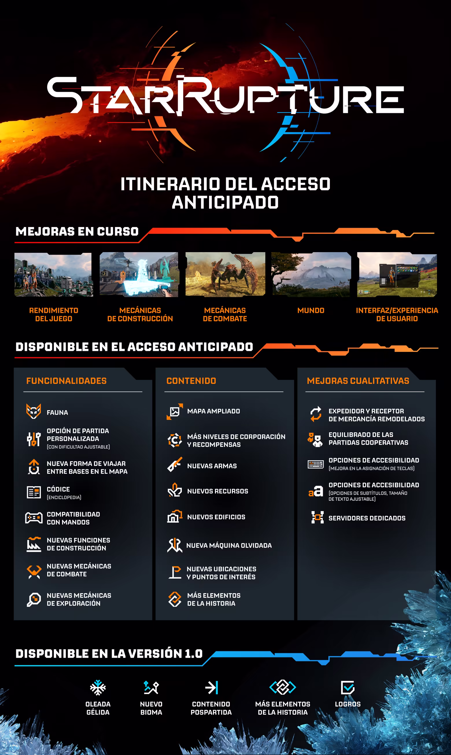 StarRupture es un juego de construcción de bases de mundo abierto y en primera persona con un sistema de combate avanzado y muchas posibilidades de exploración. Juega en solitario o con un grupo de hasta cuatro amigos en un planeta sublime y en constante cambio, extrae y gestiona recursos, establece un complejo sistema industrial y enfréntate a hordas de monstruos alienígenas.
