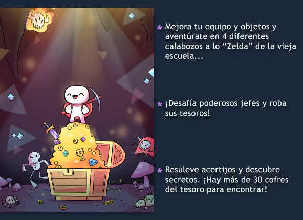 • ¡Descrifra acertijos, encuentra secretos y aventúrate en calabozos a lo Zelda!