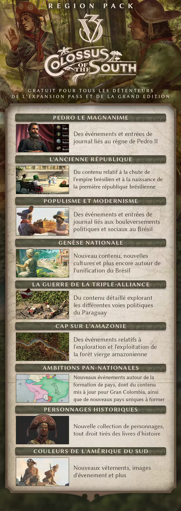 Riche en habitants, en culture et en ressources, l'Amérique du Sud entre dans l'ère victorienne avec de nombreux atouts. Mais de multiples défis attendent ces nations nouvellement affranchies de la domination européenne. Influencez le destin de l'hémisphère sud dans Colossus of the South, un nouveau pack régional pour Victoria 3.