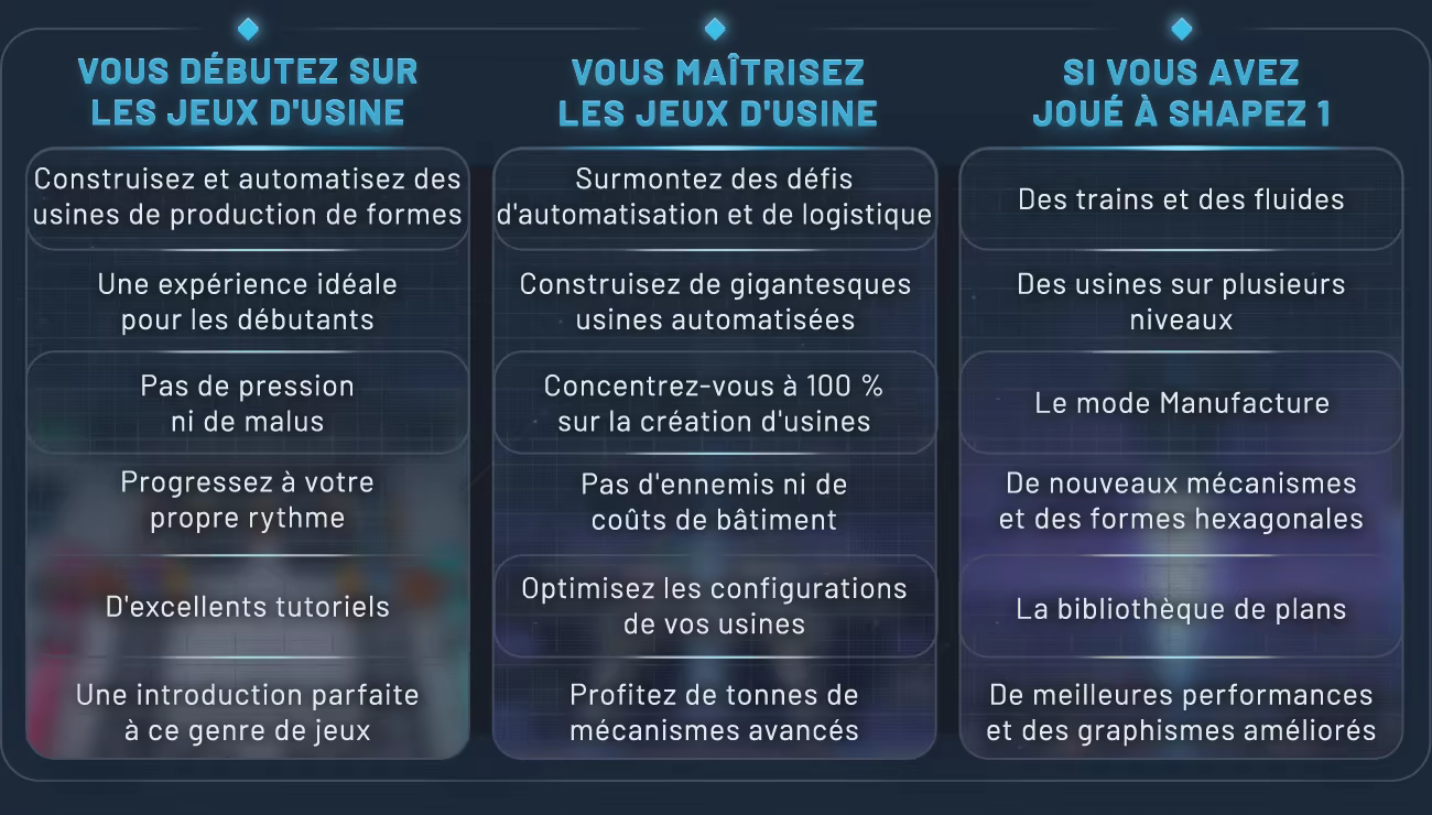 Que vous découvriez le genre ou que vous ayez l'habitude des jeux d'automatisation, shapez 2 s'adresse à tout le monde. Choisissez entre trois difficultés aux casse-tête logistiques uniques, et essayez le nouveau mode Manufacture qui vous propose de convertir des formes précises en formes inédites requises pour progresser.