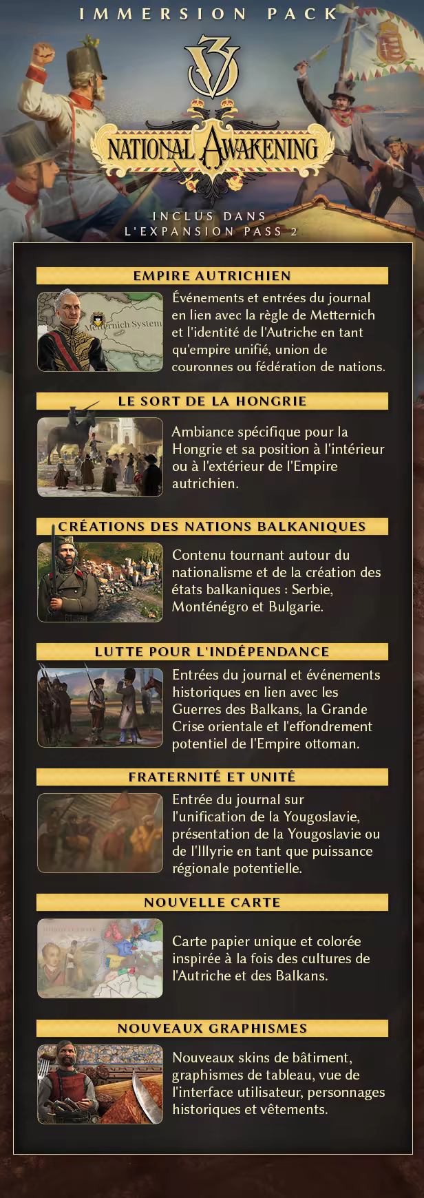 Retrouvez un siècle de luttes nationales en Europe centrale et dans les Balkans dans National Awakening, un pack d’immersion pour Victoria 3. L’Empire ottoman perd son emprise sur les territoires européens, tandis que son rival autrichien est déchiré par des conflits politiques internes, tantôt idéologiques, tantôt nationalistes. Découvrez le tumulte de cette poudrière en Europe dans ce pack d’immersion.