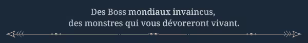 Construisez en paix, affrontez les terreurs quand vous le souhaitez. Des boss mondiaux massifs lâchent les butins les plus rares — SI vous parvenez à les terrasser. Des créatures indicibles et titanesques fendent la terre sous vos pieds comme des requins, n'attendant qu'un bruit de votre part. Des Léviathans rôdent dans les profondeurs, et les prédateurs de la surface cherchent leur prochain repas. Venez préparé. Et armé.
