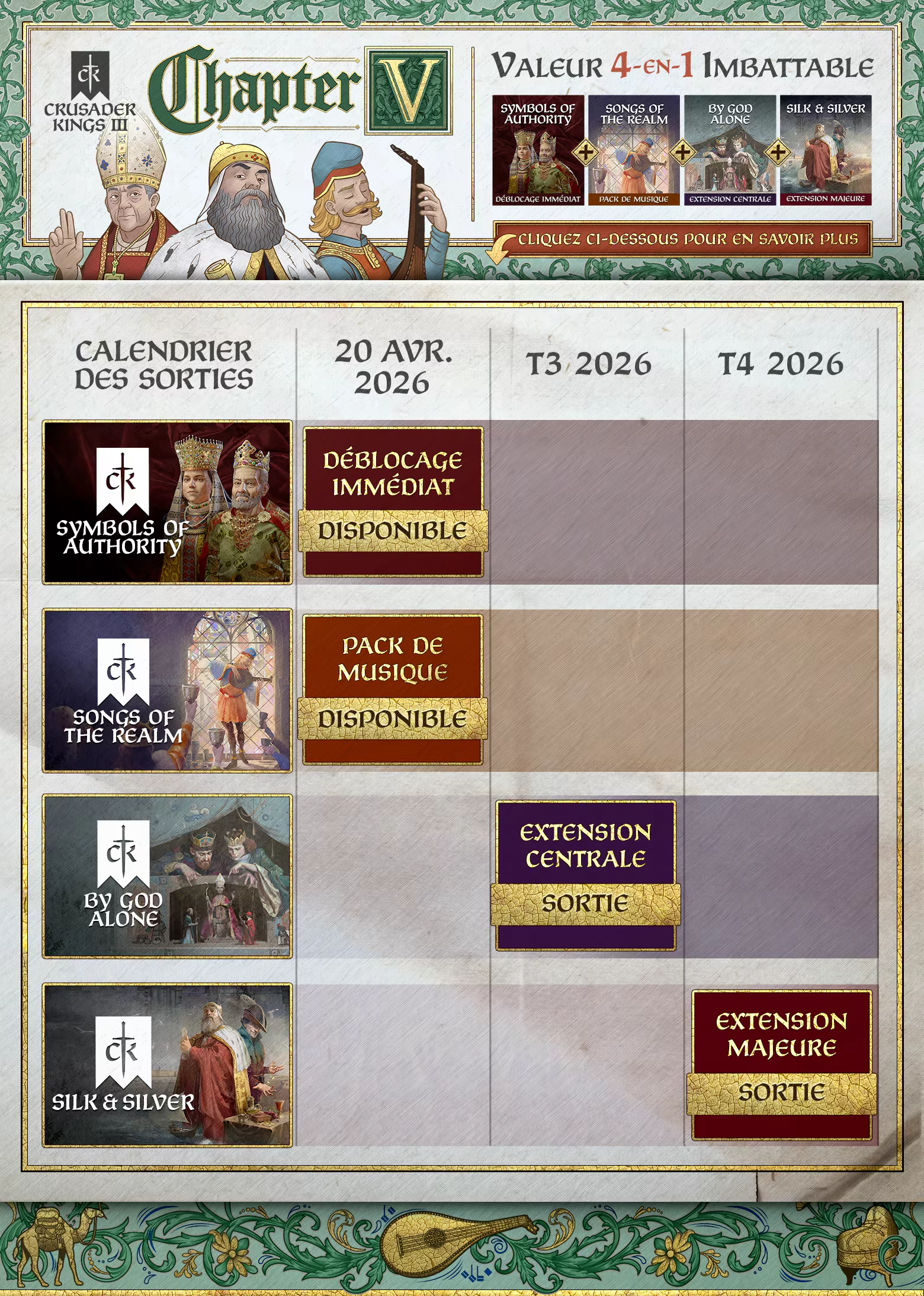 De nouvelles expériences et aventures dans un univers médiéval richement mis en scène vous attendent dans Crusader Kings III: Chapter V. Ce pass d’extension comprend une extension majeure, une extension de base, un pack musical et un pack de tenues cosmétiques. Chapter V introduit de nouvelles mécaniques de jeu qui apportent une profondeur et une variété bien plus grandes à l’expérience de Crusader Kings III, avec de nouveaux systèmes à explorer, de nouveaux gouvernements à ...