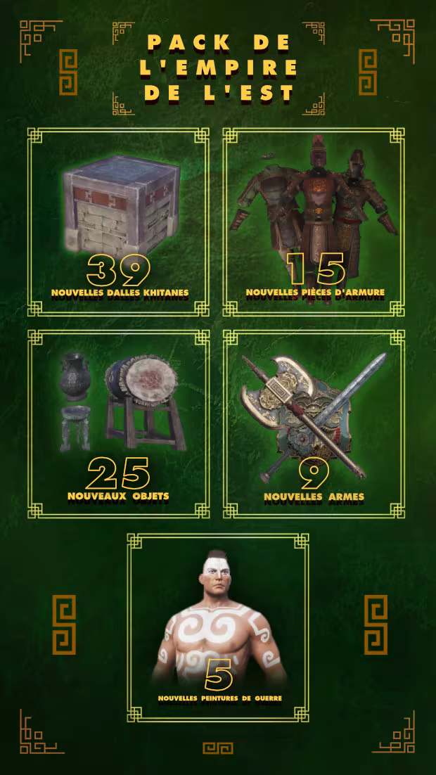 Bâtissez de somptueux palais ou d'imposants châteaux à l’aide d’un ensemble inédit de dalles qui donneront une apparence unique à vos constructions. Préparez-vous au combat avec trois nouvelles armures et un nouvel ensemble d’armes. Décorez votre foyer à l’aide de nombreux nouveaux objets tels que des chaudrons, des tapis, des tables ou des braseros et personnalisez votre apparence à l’aide de nouvelles peintures de guerre.Le pack de l'Empire de l'est contient :39 nouvelles da...