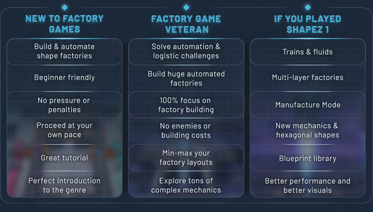 shapez 2 is a 3D factory-building game where you automate the extraction, production and delivery of geometric shapes. Each shape is its own set of building blocks that your factories can take apart, stack, paint and put back together in near-infinite different ways.Deliver specific shapes to unlock new technologies, expanding your factory’s capabilities and scale to make even more unique shapes. Grow a single conveyor belt into a massive multi-station space factory across three interconnected...