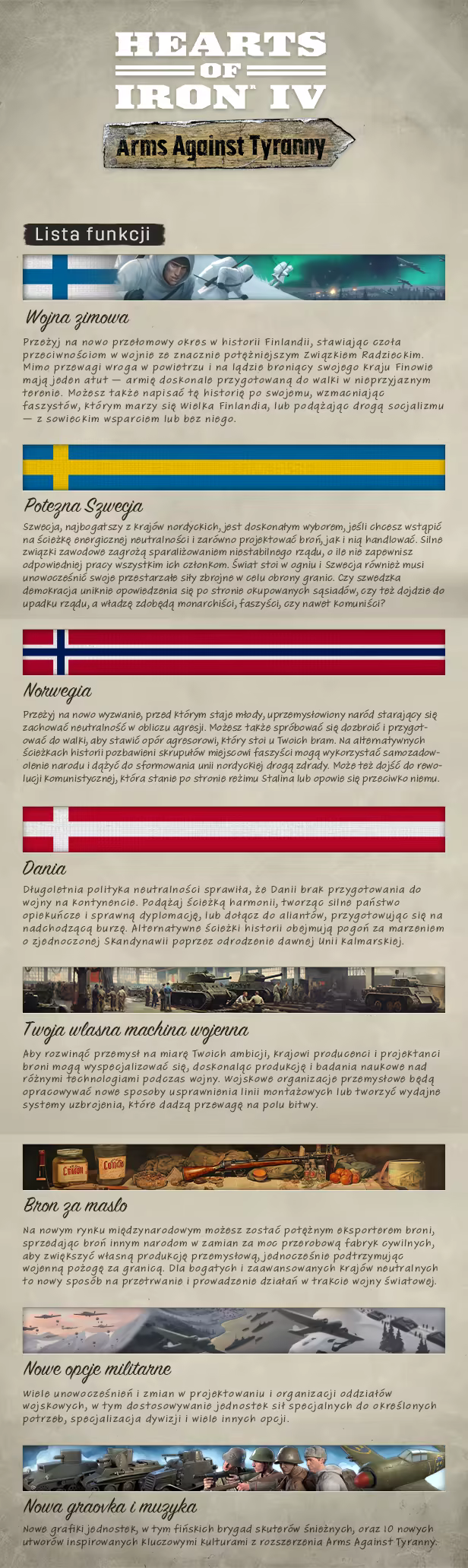 Cztery północne demokracje są pozornie bezradne wobec agresji sąsiednich dyktatur. Pomimo niewielkich terytoriów Finlandia, Norwegia, Dania i Szwecja mają szansę uniknąć podbicia poprzez sprytną dyplomację lub nieugięty opór. Napisz nową historię krajów nordyckich w Arms Against Tyranny, nowym rozszerzeniu do gry Hearts of Iron IV.