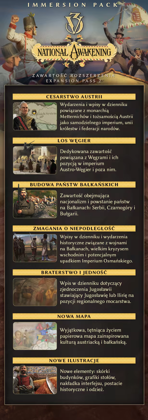 Victoria 3: National AwakeningStworzony na potrzeby gry Victoria 3 pakiet immersyjny National Awakening ukazuje pełne narodowych wyzwań stulecie w Europie Środkowej i na Bałkanach. Imperium Osmańskie traci kontrolę nad terytoriami w Europie, a jego austriacki rywal jest rozdarty przez problemy polityki krajowej o zarówno ideologicznej, jak i nacjonalistycznej naturze. Dzięki temu pakietowi uzyskasz możliwość obserwacji europejskiej beczki prochu.Victoria 3: National Awakening zawiera ...
