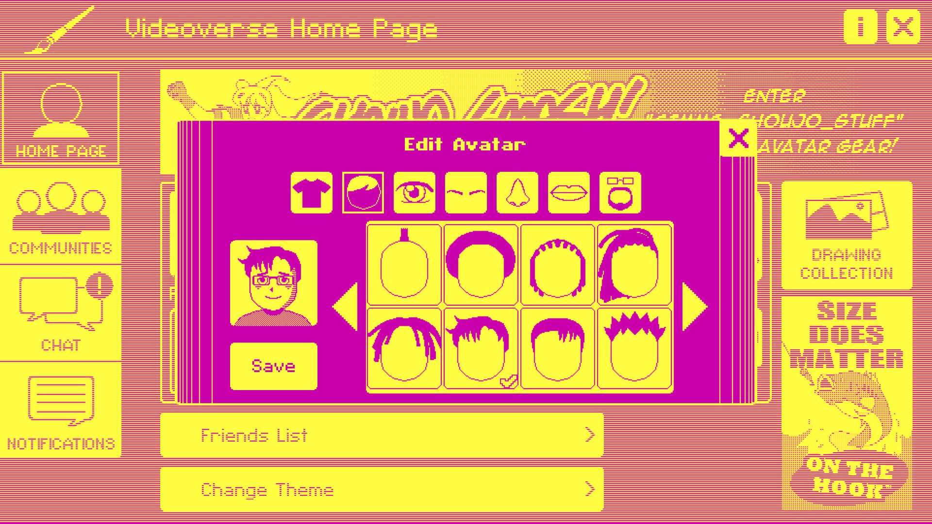 Meet a huge cast of characters, unlock multiple side stories, enjoy the pixel doodles, and seek out the truth behind the troubled social gaming network! Personalise your Videoverse experience by choosing your avatar, personal quote and favourite theme.