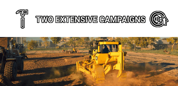 Começa a tua empresa em dois mapas separados inspirados pelas paisagens dos EUA e da Alemanha. Ambos oferecem a sua própria campanha, que te ajudará a subir na hierarquia. Friedenberg é baseado nas cidades pitorescas do sudoeste da Alemanha e apresenta colinas verdejantes e paisagens fluviais encantadoras. Aqui, o teu objetivo é contribuir para a criação de soluções de energia renovável e melhorar as infraestruturas urbanas ao longo da campanha. Além destas empreitadas significativas, encontrarás diversas tarefas que te permitem colocar à prova todas as peças de equipamento que ganhares. Sunny Haven, por outro lado, é uma verdadeira cidade portuária de estilo americano que terás de revitalizar de modo a recuperar a indústria do turismo. No conjunto, esperam por ti mais de 90 contratos emocionantes em ambos os mapas, por isso encontrarás sempre algo novo para explorar!